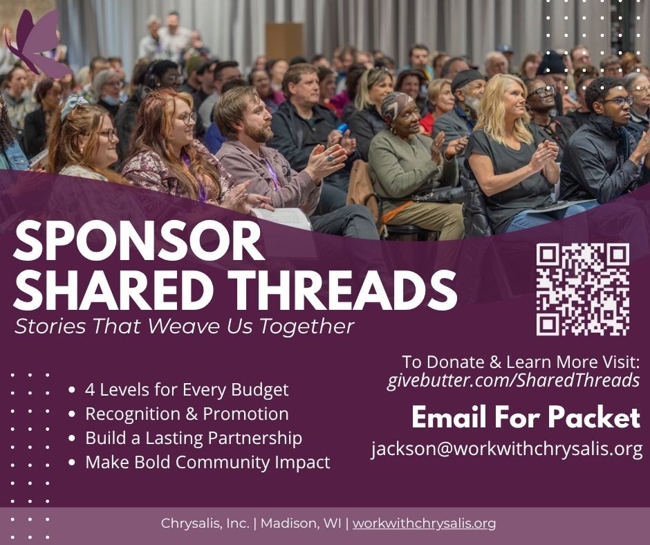 Who: Shared Threads is a FREE event open to the public. Donations are encouraged to keep this event free and contribute to our core mission. Your support, monetary or through attendance, uplifts Chrysalis’s mission of hope, healing, and wellness, and directly empowers our courageous storytellers. Bring a friend, coworker, or neighbor to experience this intimate evening with us!